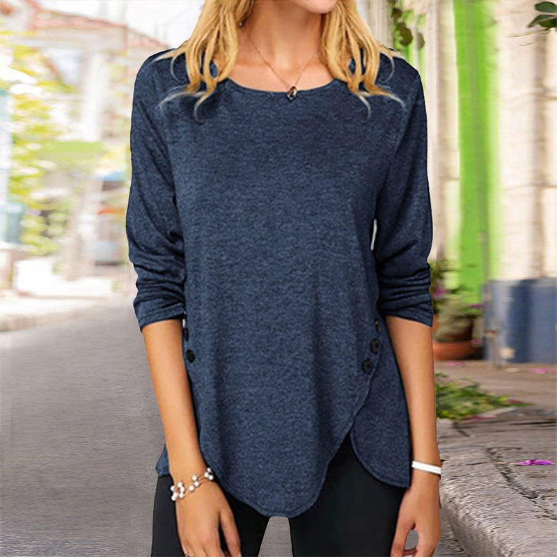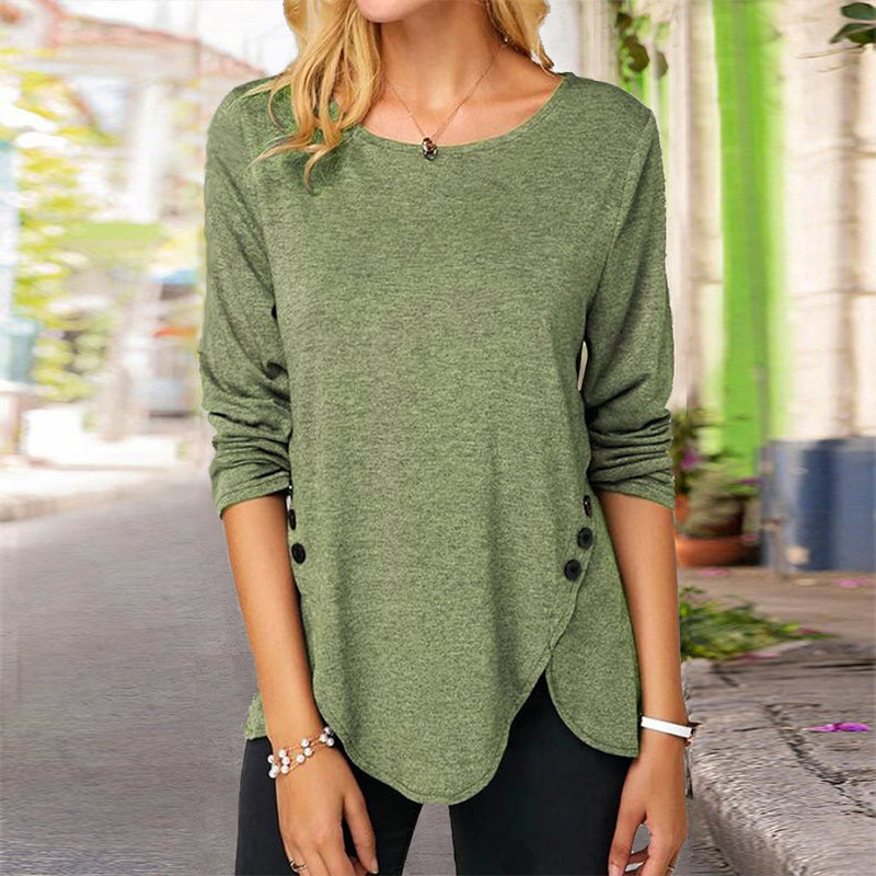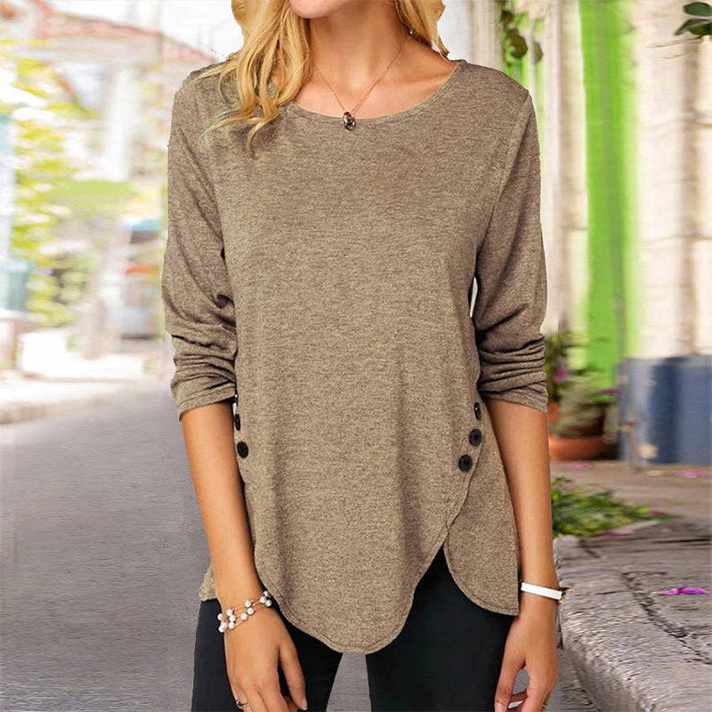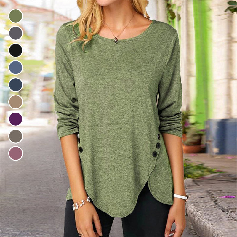 • Product Features: Long-sleeved round neck solid color tunic top with side buttons and irregular hem. Casual loose fall shirts, everyday tee tops, tops for outdoor shopping. Simple and stylish design. The length is moderate enough to cover the body.