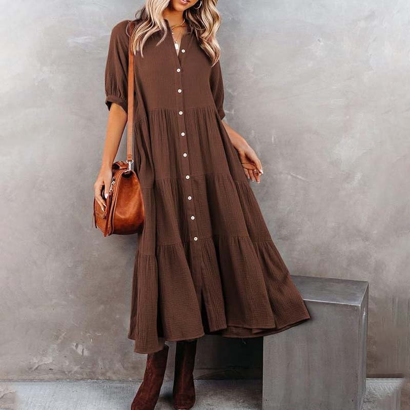 This Casual Dress Features a Very Soft and Comfortable Cotton Fabric, it has a Collar and Half Sleeves, with Button Closures From Top to Bottom and Pockets on Both Sides.