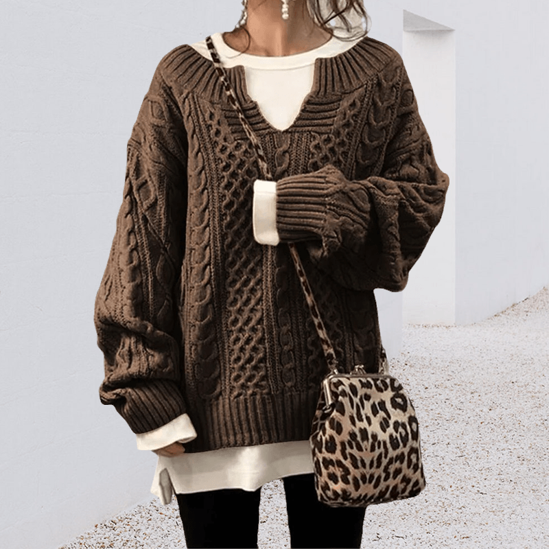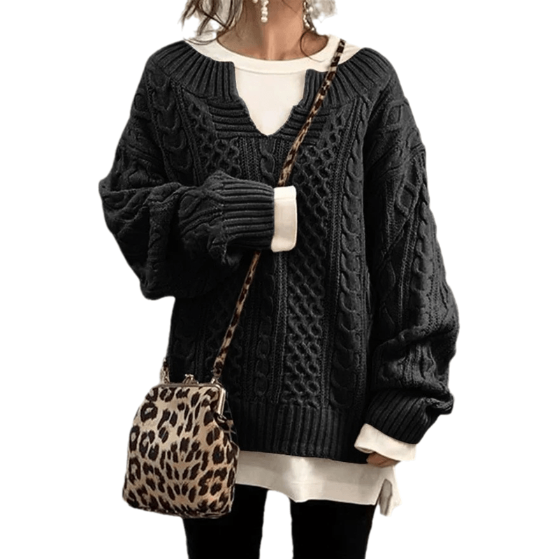 coatThis oversized cable knit sweater will keep you super cozy and stylish, designed with a short round collar v-neckline and extra-long sleeves.