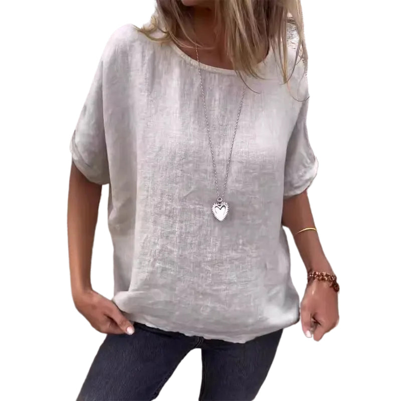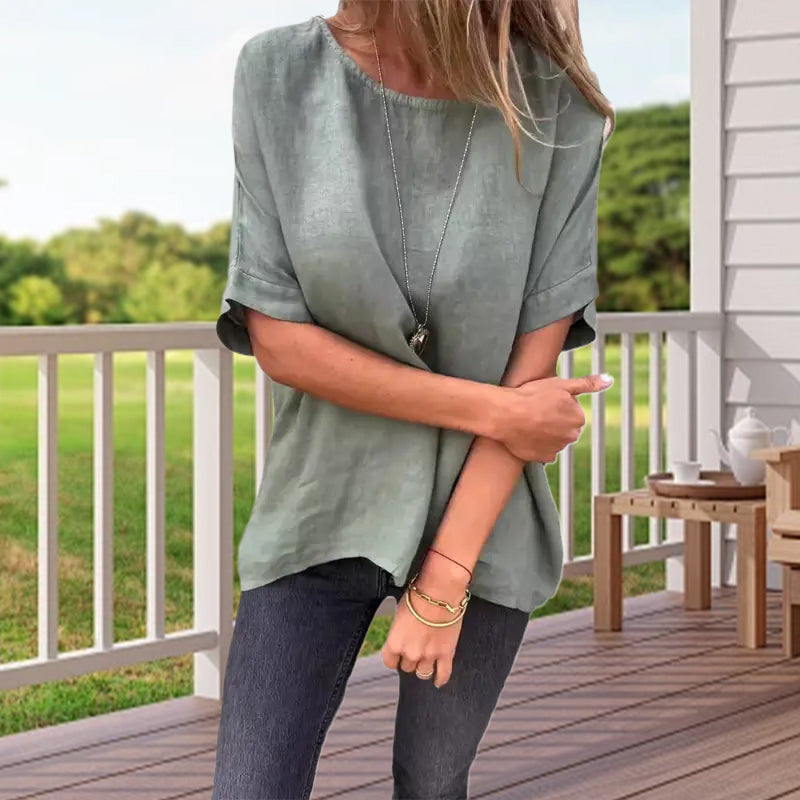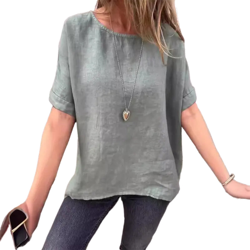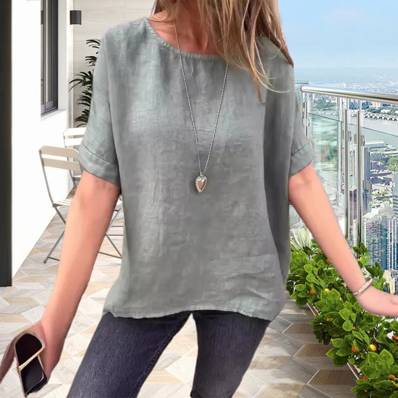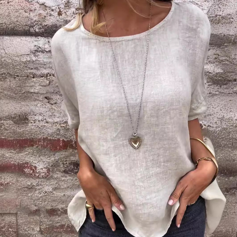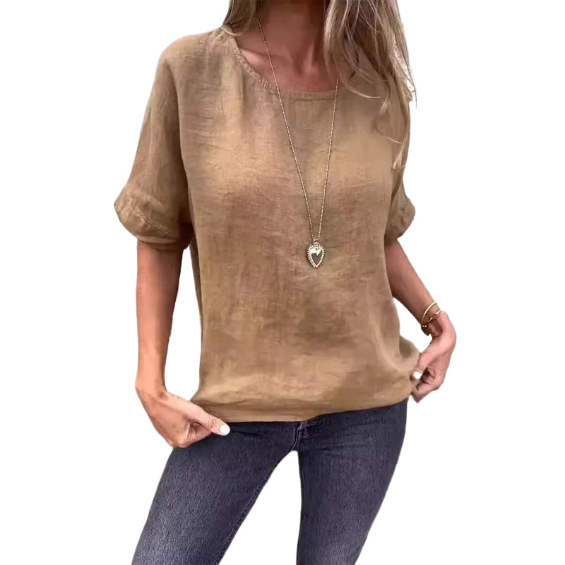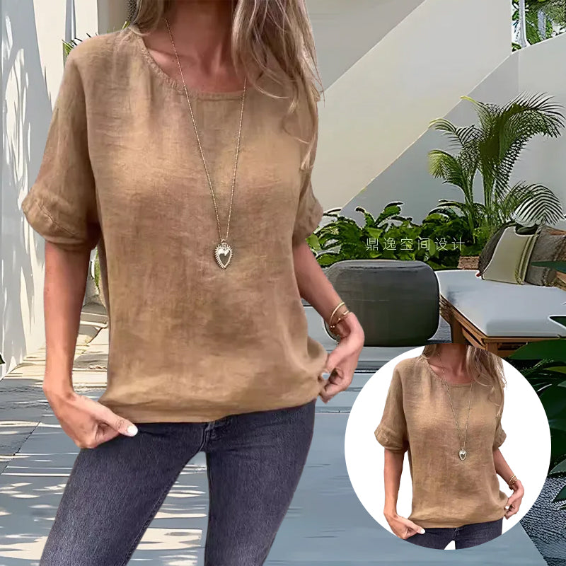 Experience everyday comfort and timeless style with our Women's Solid Color Round Neck Half-Sleeved Cotton Linen Blouse.