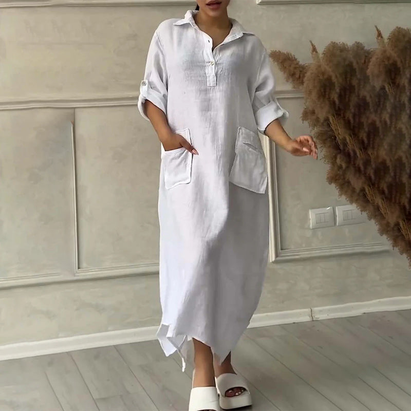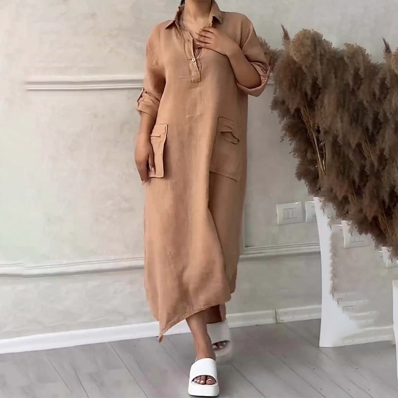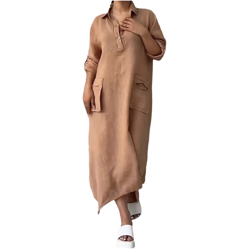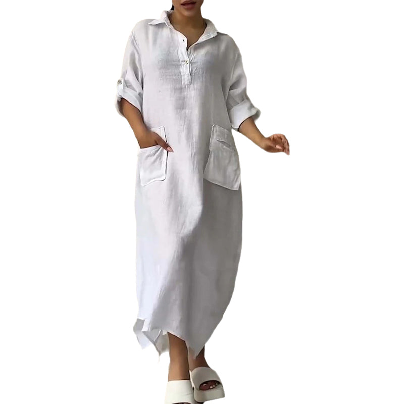 Women's Cotton Linen Casual Lapel Pockets Long Dress