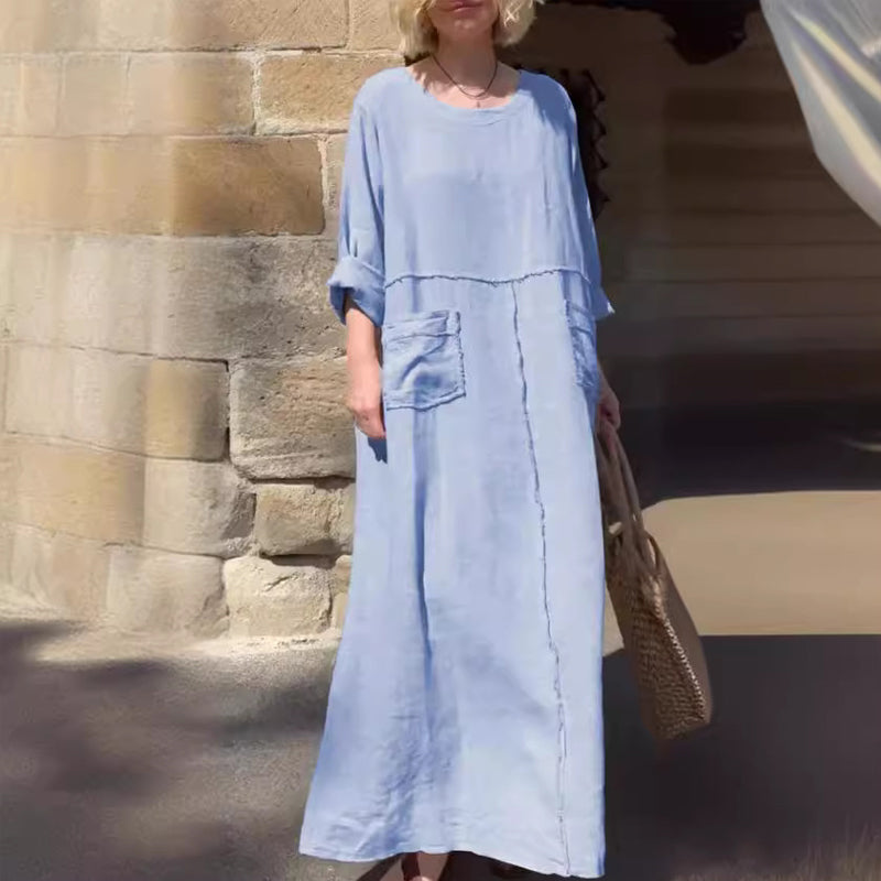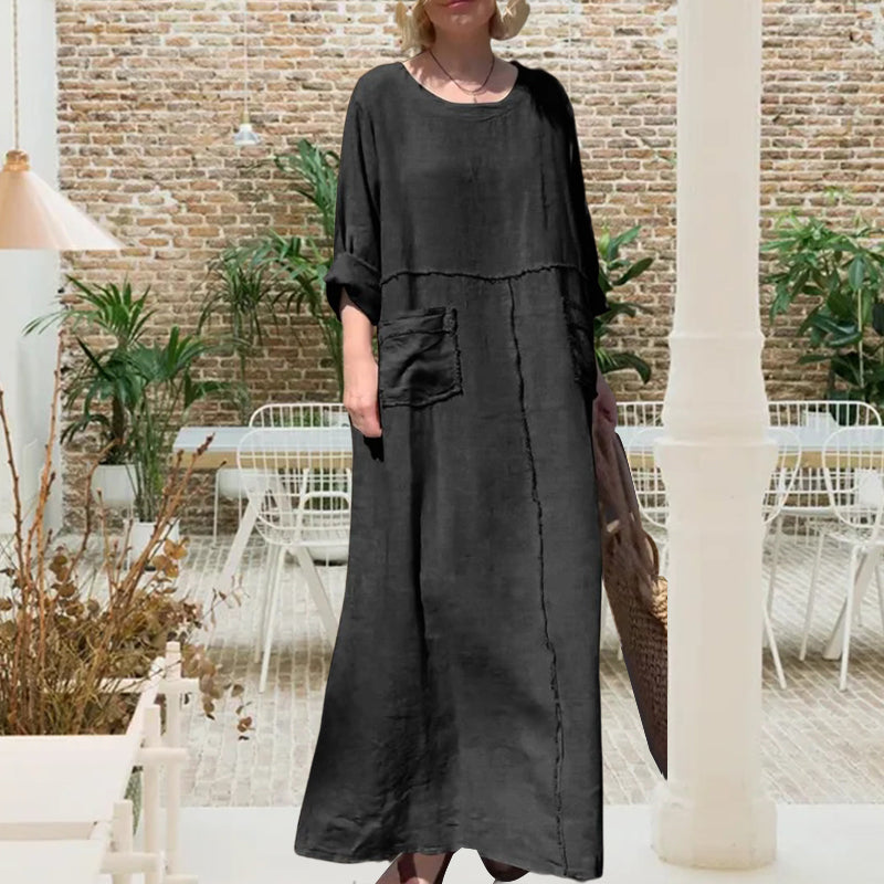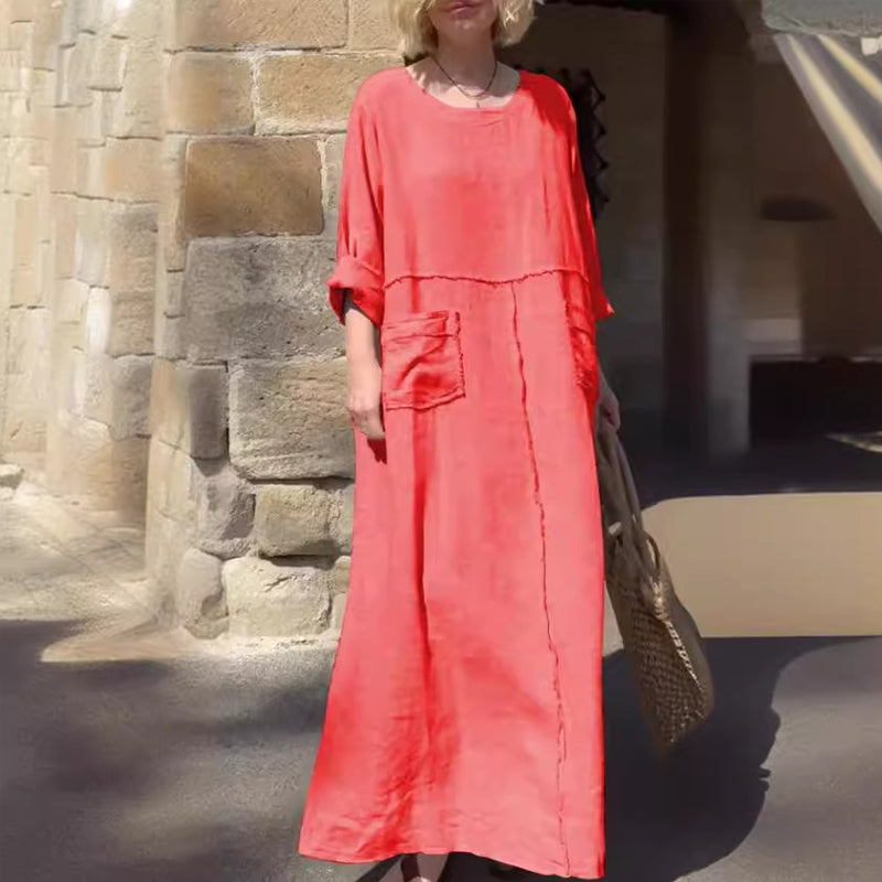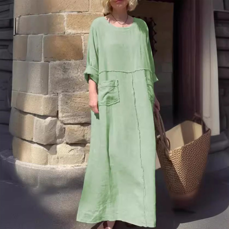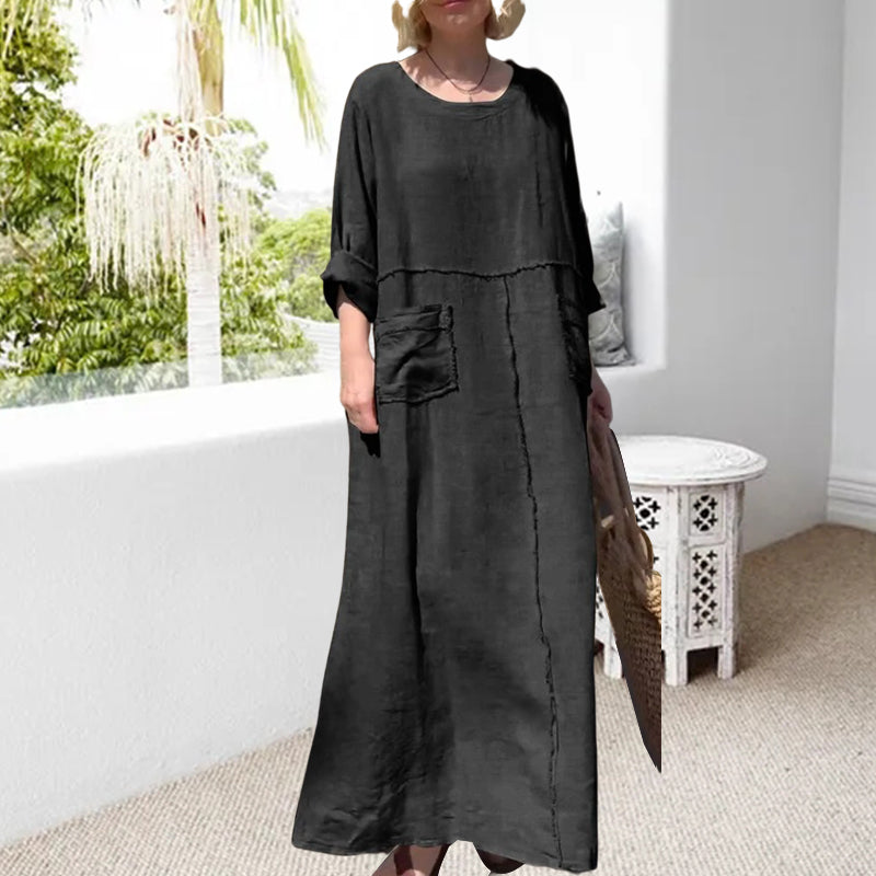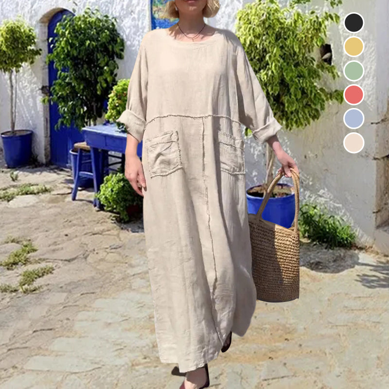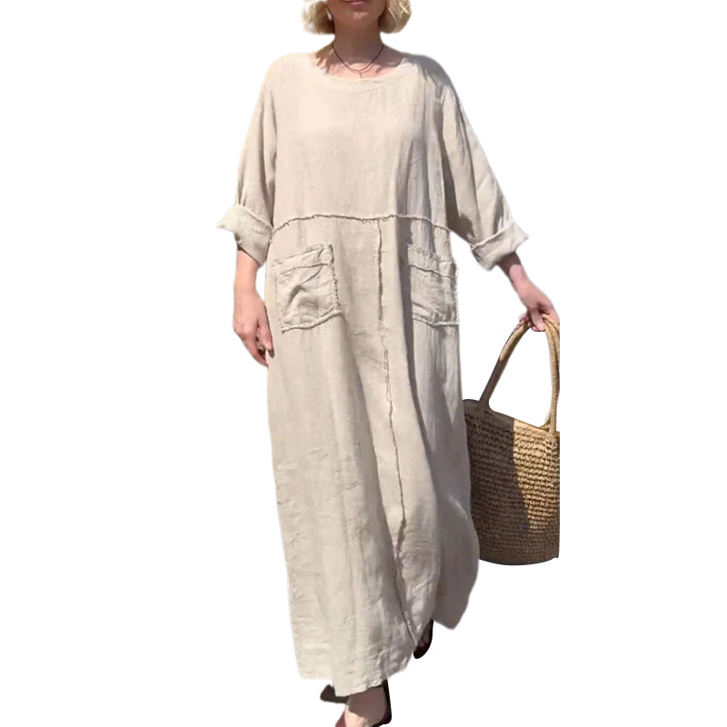 • 1* Round Neck Cotton and Linen Long Sleeve Casual Dress